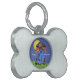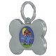 Dieses knochenförmige Haustiernamensschild hat eine Schnittmarkierung in der blauen Jeans und ein rot-weißes kariertes Shirt mit einer Krähe, die auf jeder Schulter sitzt, und einer schwarzen Katze zu seinen Füßen mit einem vollgelben Mond dahinter. Passen Sie den Namen Ihres Haustieres und Ihre Telefonnummer mit den Vorlagen an.