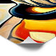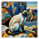 A.I. erstellt Druck einer stilisierten siamesischen Katze mit auffallenden blauen Augen liegt zwischen lebendig gefärbten Felsen am Meer.