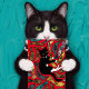 Eine ungewöhnliche Karte mit einer Katze, die in einem roten Himmel zwischen einer Ladung seltsamer Fische schwebt.