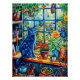 Eine schwarz-blaue Katze sitzt auf einem Fensterbrett in einem Gartenhaus, umgeben von Blume in einer ruhigen Umgebung.