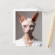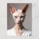 Hier ist ein einzigartiges Wesen - vielleicht ein Mensch-Katze-Hybrid - das Perlen rockt und eine weiße Bluse. Sie sieht auch hübsch ernst aus. Sie ist drin, um es zu gewinnen. Unterschätze niemals eine Sphynx-Katze, die Perlen trägt.