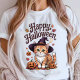 Schlagen Sie sich dieses Halloween einen Zauber mit unserem zauberhaften 'Happy Halloween Witch Kitten' Design! Diese unwiderstehlich charmante Grafik zeichnet sich durch ein flauschiges, orangefarbenes Tischkätzchen aus, weit mit Augen und bezaubernd, das einen klassischen lila Hexenhut verbindet. Unser kleiner Freund ist umgeben von grinsenden Jack-o''-Laternen und verstreuten Herbstblättern, die eine festliche und skurrile Szene bilden.