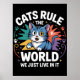 Diese skurrile Grafik zeichnet sich durch einen zauberhaften, blau-weiß gestreiften Cartoon mit hellgelben Augen und einem fröhlichen, offenen Ausdruck aus, der zufrieden sitzt. Hinter dem Katzen stehen kühne, abstrakte Formen in aquamarinen, orangen und lila Formen, die ein Gefühl dynamischer Energie hervorrufen. Der prominente Text in farbigen, spielerischen Schriftart lautet: "CATS RULE THE WORLD", gefolgt vom humorvollen Eingeständnis "WIR LEBEN GERADE IN IT". Verschiedene Sterne und paw-Druckakzente sind rund um das Design verteilt, alles Set auf einem soliden schwarzen Hintergrund. Digitaler Download nur für den persönlichen Gebrauch.