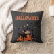 Niedliches Halloween. Runde Kuchen mit Katze, weißer Schädel, Fledermaus auf schwarz-orange Unterlage. Farbenfrohe Löffel Halloween