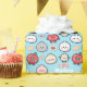 This pattern is special for its extremely cute, kawaii-style snack and food characters. It features a seamless repeating design of smiling dumplings, apples, and Asian-inspired sweets. The arrangement naturally forms a circular frame around a light blue center, making it ideal for personalization or a fun border print. This cheerful, modern illustration is perfect for children's items, lunch bags, or foodie products.