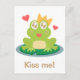 Kawaii Cartoon eines Frosches mit glitzernden Augen und einer Krone auf dem Kopf. Der Froschprinz sitzt auf einem Lilienpolster im Teich. 2 Herzen um den Kopf addiert zur romantischen Atmosphäre des Designs. Aktuelle Wörter lauten: "Küss mich!" Dieses hübsche, ansprechende und farbenfrohe Design ist ideal für alle, die in der Liebe sind. Entworfen von Rusty Doodle.