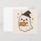 Ein bezaubernder Geist im kawaii-Stil, der Süßigkeiten trägt, einen Hexenhut trägt und von goldenen Sternen umgeben ist. Ideal für niedliche Halloween-Liebhaber und Fans der pastellfarbenen Ästhetik. Ideal für Aufkleber, Tasse, Totbeutel und T - Shirt.