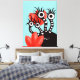 Niedliche Monster-Leinwand-Kunst mit einer Kreatur aus schwarzem Cartoon mit vier Augen auf langen schwarz-weiß gestreiften Stiele lächeln, versteckt in abstrakten roten Tulpen.