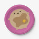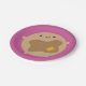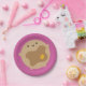 Ein niedlicher glücklicher Pfannkuchen mit Sirup und Butter auf einem rosa Hintergrund.