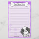 Buntes Kawaii Japanerchin-Briefpapier mit einem Cartoonschwarzweiss-Hündchen in der unteren rechten Ecke. Der Spitzenteil kann mit Ihrem Namen innerhalb des großen Hündchenknochens sofort besonders angefertigt werden. Grenz- und Papierhintergrund sind- lila.