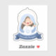Charmante kawaii Jungfrau Mary von der Unbefleckten Empfängnis, lächelnd mit einer Blume in der Hand und einem Banner mit bearbeitbarem Text. Eine süße spirituelle Illustration, die Hingabe, Freude und Kulanz verbindet, ideal für personalisierte, inspirierte Gaben.