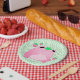 Ästhetischer Kawaii Erdbeerfrosch-Kern aus Gürtelauge-Design mit grünem Swirl-Muster Hintergrund.