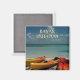 Dieser Andenken-Magnet verfügt über ein Foto, das an einem Strand auf einer Außinsel der Bahamas aufgenommen wurde. Blauer Himmel und türkisfarbener Ozean mit bunten Kajaks im Vordergrund.