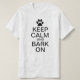 Keep Calm and Bark On. Dog Carry On Parody propaanda slogan. With a black paw print. Fully customizable.