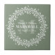 Blumenkalligrafie Typografie Monogram Keramik Tile in Sage Green und White - Stilvolle grün-weiße mit Monogramm Keramik Kachel Geschenk für neu gezogene Paare, die ein maßgeschneidertes Monogramm, Bräutigam & Brautnamen, Nachname und Hochzeitstermin Vorlagen umgeben von einem kühnen Blumenkranz. Ein nachdenkliches Geschenk für ein Party oder Hochzeitsgeschenk für ein Paar. ©Sweetwhimsypaperie