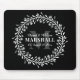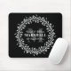 Blumenkalligrafie Typografy Monogram Mouse Pad in Black and White - Stilvolle mit Monogramm Mousepad-Geschenke in Schwarz und Weiß für ein frisch gezapftes Paar, das mit einem individuellen Monogramm, Bräutigam & Brautnamen, Nachnamen und Hochzeitstermin-Vorlagen umgeben von einem kühnen Blumenkranz. Ein nachdenkliches Geschenk für ein Party oder Hochzeitsgeschenk für ein Paar. ©Sweetwhimsypaperie