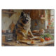 Add a fluffy and cheerful touch to your kitchen with this Keeshond design featuring a smiling pup cooking in a cozy setting. With its thick coat, signature facial markings, and friendly expression, this artwork captures the breed’s lively and affectionate personality.