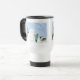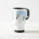 Keeshond Holiday Travel Mug. Happy winter scene with a child and grandpa building a Keesie snow dog. Cute Keeshond is enjoying the cold weather and snowfall. Visit Jenn’s Doodle World for more Keeshond art and gifts. ©Jenn Inashvili