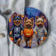 Adorable Keeshonds, die in spielerischen Halloweenkostümen gekleidet sind, tragen Kürbiseimer, während sie unter dem mondbeleuchteten Himmel tricksen oder behandeln. Dieses festliche Design hebt den flauschigen Doppelmantel der Rasse, das fuchsartige Gesicht und die lebendige Persönlichkeit hervor, die perfekt die sprichwörtliche und dennoch lustige Atmosphäre Halloween-Abends einfangen. Eine charmante Feier für Hundefreunde und Halloween-Fans gleichermaßen.