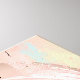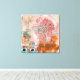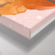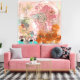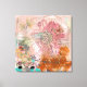 Die lebhafte und abstrakte Komposition vereint Farben wie Rosa, Braun, Orange und aquamarin, mit Blumenelementen und einem Schmetterling. Verschiedene Formen und Linien verleihen dem Stück Dynamik.