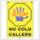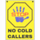 No Cold Callers Sign - Yellow Stopp Sticker - Ein "No Cold Callers"-Zeichen ist ein Hinweis oder ein Etikett, das an Türen, Fenstern oder Toren deutlich sichtbar angebracht wird, um Einzelpersonen, insbesondere Verkäufer oder Anwälte, darüber zu informieren, dass sie nicht willkommen sind, unaufgefordert Besuche oder Verkaufsgespräche zu führen. Das Schild ist ein deutlicher Hinweis für potenzielle Anrufer, dass die Insassen des Gebäudes nicht durch unerwünschte Verkaufs- oder Werbetätigkeiten gestört werden wollen.