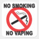 Kein Rauchen Kein Vaping Warnschild Aufkleber mit Symbolen für Zigarette und E-Zigarette und roten Schrägstrich.