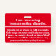 Ein nützliches zu den Anbietern zu übermitteln Werkzeug, dass Sie in der Erholung von einer essenden Störung sind und Ihr eigenes Gewicht nicht kennen können. Dieses Abzeichen kann zu leicht übergeben werden oder vorbei gesehen werden, eine Krankenschwester oder ein Anbieter wie eine nonverbale Erinnerung, um Sie nicht zu wiegen (oder nicht mit Ihnen jene Gewichtszahlen teilen). Dieses Produkt ist passend, in einer Geldbörse getragen zu werden oder behalten zu werden. Dieses Produkt ist mit Seiten versehen doppeltes.