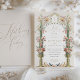Erleben Sie Liebe und Einfachheit mit unserer eleganten Liebe für Hochzeitsfeiern. Das Design besticht durch eine erlesene Mischung aus Aquarellblumen in Pfirsichtönen, Rosa, Korallen und Gelbtönen, die elegant mit grünen Grüntönen und subtilen Lavendeltönen verwoben sind. Die botanische Anordnung bildet einen anmutigen Bogengang und bildet das klassische Drehbuch, das eine herzliche Botschaft liefert. Eine Vintag inspirierte dekorative Vase in goldener Farbe verankert die Komposition und verleiht der Touch zeitloser Romantik eine besondere Note. Auf der anderen Seite wird der weiche cremefarbene Hintergrund durch fließende Kalligraphie ergänzt, die das Thema der unverschönerten Zuneigung betont. Diese Einladung ist ideal für Paare, die eine raffinierte, aber dennoch schlichte Ankündigung für ihren besonderen Tag wünschen.
