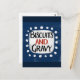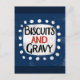 Ein lustiges und niedliches typografisches Design, das "Biscuits And Gravy" sagt. Er hat schwarz-roten Text auf einem weißen Rechteck mit funky, spielerisch weißen Punkten, die ihn umgeben, alle auf blauem Hintergrund.