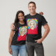 Portrait der britischen Frauenrechtlerin Kellie Jay Keen. Bombastischer blonder Bob, braune Augen, rotes Shirt. Rainbow-farbener Halo-Icon-Hintergrund.