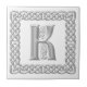 Diese keltische themed trivet Fliese kennzeichnet verwickelte keltische Knüpfarbeit in einem schattierten silbernen Effekt. Eine quadratische Knüpfarbeitgrenze schließt eine große groß geschriebene Initiale oder ein Monogramm K. ein. Ein wunderbares dekoratives Element, zum Ihres schottischen, irischen, Waliser-, kornischen oder französischenkeltischen kulturellen Erbes innerhalb Ihres Zuhause oder Büros anzuzeigen. Diese vielseitige Fliese kann gerahmt auch sein, oder gemacht in einen Trinket- oder Andenkenkasten.