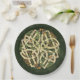Auf einem dunklen Waldgrün-Damasthintergrund die digitale Version eines alten keltischen Symbols: Eine Kreisverzierung, die von den Schlangen gemacht wurde, entwirrte sich in den typischen traditionellen keltischen Knoten. Die Konturen der Verzierung sehen wie Führung aus, tectured das Innere in hellgelbem und in hellgrünem.