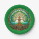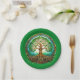 Papier-Teller in einem stilisierten keltischen Baum des Lebens, aufwändig detailliert mit sich verwobenen Zweigen und Wurzeln, die einen Kreis bilden, umgeben von verzierter keltischer Knüpfarbeit. Die lebhaften grünen Blätter und der goldbraune Kofferraum symbolisieren Harmonie und Verbundenheit