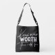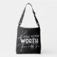 Know Your Worth Inspirational Motivierend Quote Crossbody Bags bietet moderne Kalligrafie-White-Skripte mit dem lustigen positiven Sprichwort "Know your worth then add tax". Von Evco Studio entworfen www.zazzle.com/store/evcostudio