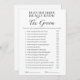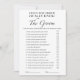 Die Einführung der Brautparty-Game-Card "Weiß die Braut wirklich den Bauch" von CaMiDesigns. Diese minimalistische Schwarz-Weiß-Spielkarte verleiht Ihren Brautparty-Festlichkeiten eine Touch Eleganz und bietet gleichzeitig eine lustige Möglichkeit, die Braut auf ihre Bräutigam zu testen. Dieses Spiel ist perfekt, um unvergessliche Momente zu schaffen und unter den Gästen zu lachen. Es ist eine angenehme Ergänzung zu jeder Feier. Für Unterstützung bei Bestellungen, Versand, Produktinformationen und vielem mehr wenden Sie sich bitte direkt an den Zazzle Kundenservice.