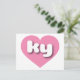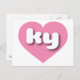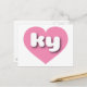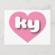 Diese Postkarte zeigt ein pulsierendes rosa Herz mit dem fett-weißen, abgerundeten Buchstabenkeil, eine spielerische Abkürzung für Kentucky, den Bluegrass-Staat. Die Rückseite der Postkarte ist leer und wartet auf Ihre handgeschriebenen Stimmungen oder Ihren personalisierten Text.