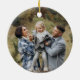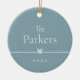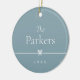 Der süße und einfache Weihnachtsschmuck zeichnet sich durch eine minimalistische Gestaltung aus, mit Ihrem Familiennamen und dem Jahr in einer sauberen, klassischen Serifenschrift auf einem weichen blauen Hintergrund. Ein kleiner Bogen durch die Mitte vervollständigt das Design. Fügen Sie der Rückseite ein Foto hinzu.
