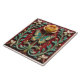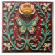 Symmetrisches Design mit einem Schmetterling mit gelben und grünen Flügeln, zentriert unter einer gelben Blume, umgeben von grünen Blätter und weißen Blume, alles Set vor einem roten Hintergrund.