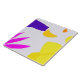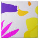 Diese Keramik-Kachel zeigt dreieckige und Bio Formen in Fuchsien, Gelb, lila und Orange, die auf der Lavendeloberfläche angeordnet sind.