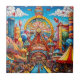 lebhafte und farbenfrohe Parklandschaft. In der Mitte befindet sich ein großes Riesenrad mit dem Wort "SKYLANE". Das Riesenrad ist von verschiedenen skurrilen Strukturen umgeben, darunter Türme und Zelte mit Fahnen. Der Himmel ist voll von Heißluftballons und flauschigen Wolken. Auf den Wegen wird eine Menge Besucher gesehen, die die festliche Umgebung genießen. Das Ambiente ist eine aufregende und unterhaltsame Atmosphäre, typisch für einen Messe- oder Themenpark.
