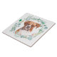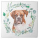 Ein Aquarellporträt eines braunen und weißen Boxerdogs in einem blau-grünen Blattkranz ist das Merkmal dieser dekorativen und nützlichen Kachel. Ideal für jeden, der einen Boxer Liebe.