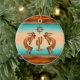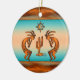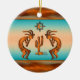 Personalisieren Sie dieses "Eine von einer Art" Südwest Kokopelli Weihnachtsschmuck! Es hat zwei südwestliche Kokopelli in Kupfer und Schwarz Playing the Flute und Tanzen rund um einen Kaktus Unter der Sonne auf einem ... Türkis und Orange Sonnenuntergang Hintergrund! Original Art Design von Künstler Kerry Miller.