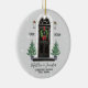 Dieses Weihnachtsgeschmuck mit einem hellgrauen, schneebedeckten Hintergrund mit einer Türenszene inklusive Weihnachtsbäumen und einem Kranz mit kariertem Gingham passt zu unserer Zuhause For the Holidays Kollektion. Dieses Keramik Sake-Ornament ist perfekt für Neuvermählte oder ein Paar, das gemeinsam in einer neuen Zuhause oder Wohnung ihr erstes Weihnachten feiert! Auf der Rückseite ist ein roter Gingham kariert.