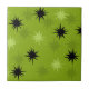 Diese Atomic Green Sternexplosion Keramik Tile hat den ganzen modernen Spaß der Küche Ihrer Großmutter, abzüglich des klebrigen Linoleums. Das kitschige Design ist mit einem grünen Hintergrund mit goldenen Fußketten und zufällig platzierten Sternexplosionen in schwarz und zwei Grün-Tönen gestaltet. Dieses Vintag inspirierte Muster ist Mod genug, um stylisch und Retro genug zu sein, um klassisch zu sein. Mit diesem minimalistischen Design lassen Sie sich etwas Liebe geben.