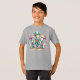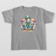 Der T - Shirt dieser Jungen enthält drei niedliche, skurrile, lächelnde anthropomorphe grüne Frösche, die in aufwändiger, farbenfroher Viktorianischer Kleidung verkleidet sind und unter mächtigen Pilzen tanzen. Der größte Frosch im Zentrum hat einen Tophut, der mit einer Blume geschmückt ist, und Federn, die eine Aura der sonderbaren Eleganz ausstrahlen.