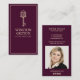 Skelettschlüssel mit Haus integriert als Teil seines Designs - Visitenkarte im vertikalen Format mit bordeauxfarbenem Hintergrund. Anpassen Sie einfach mit Ihrem Foto auf der Rückseite, das auch Social Media-Icons enthält.