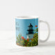 Foto des Key West Lighthouse in Key West, Florida, mit Palmen und blühenden Bäumen im Vordergrund. Anpassbare Textform und Tasse Stil, Größe und Farbe.