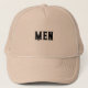 Khaki Color Looking Handsome MEN Text Trucker Hat, Sie können den MEN Text bearbeiten oder ändern. Ein LKW-Hut, auch bekannt als Meshkappe oder Schnappdeckel, ist eine Art Baseballkappe, die sich durch ihre Rückenlehnen-Mesh-Paneele und einen leicht gekrümmten Schein an der Vorderseite auszeichnet. Der Vorderteil des Hutes ist oft aus Schaumstoff gefertigt und größer als die Stofffront der traditionellen Baseballkappen. LKW-Hüte verfügen in der Regel über einen Kunststoff-Schnappverschluss an der Rückseite, der eine einstellbare Größensortierung ermöglicht. Die Mesh-Paneele auf der Hutrückseite sorgen für eine Belüftung und eignen sich somit für Aktivitäten im Freien. Der Stil wurde wegen seines lässigen und entspannten Erscheinungsbildes gepflegt.
