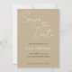 Einfache Hochzeit im Stile rette den aktuellen Einladungen, die weiße, stilisierte Schrift auf einem trendigen, khaki farbigen Hintergrund enthalten. Bearbeiten und ersetzen Sie Namen, Datum und Position mit Ihrem eigenen. Wählen Sie Ihre Einladungsgröße und Ihren Papierstil aus.