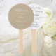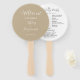 Hochzeitstag-Programm gedruckt auf einem runden Handventilator, der einen trendigen, khaki-farbigen Hintergrund auf der Vorderseite mit den Braut- und Bräutigamen in weißem, stilisiertem Skript aufweist. Auf der Rückseite des Programms sind die Teilnehmer der Hochzeitsfeier und die Zeremonie-Rites auf weißem Hintergrund mit dunkelgrauer Schrift aufgeführt. Bearbeiten Sie den Handventilator und ersetzen Sie die Informationen zum Hochzeitsprogramm durch Ihre eigenen. Ideal für eine Hochzeitsfeier im Innen- oder Außenbereich! Wählen Sie die gewünschte Anzahl von Hand-Lüfterprogrammen aus.